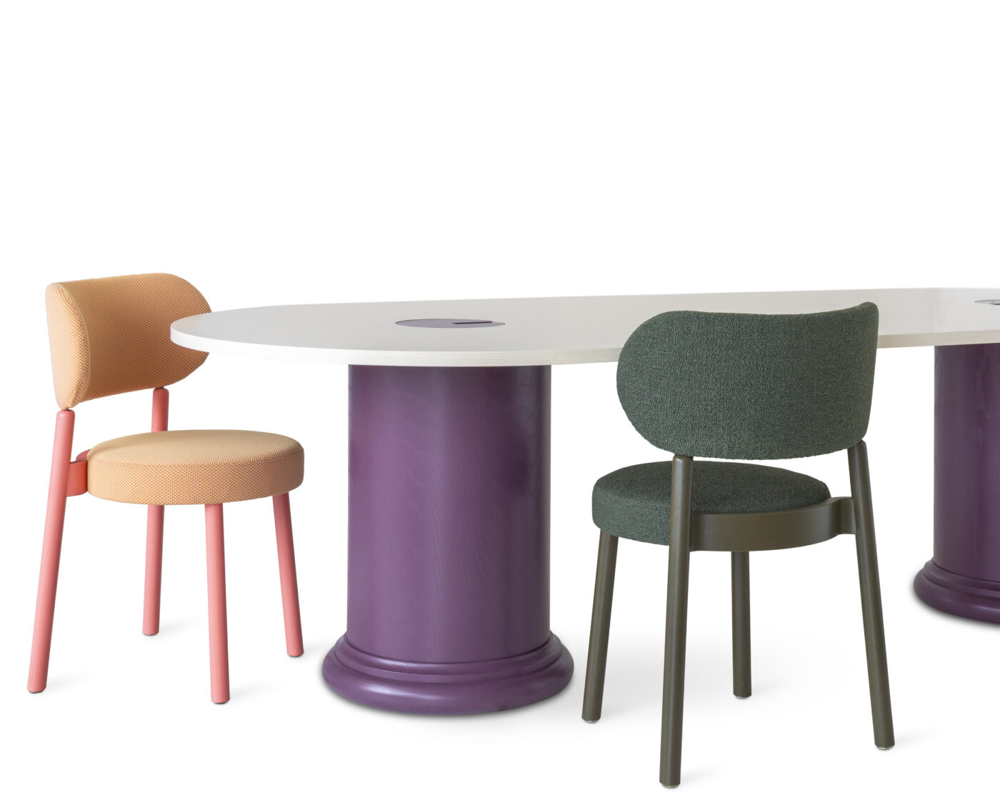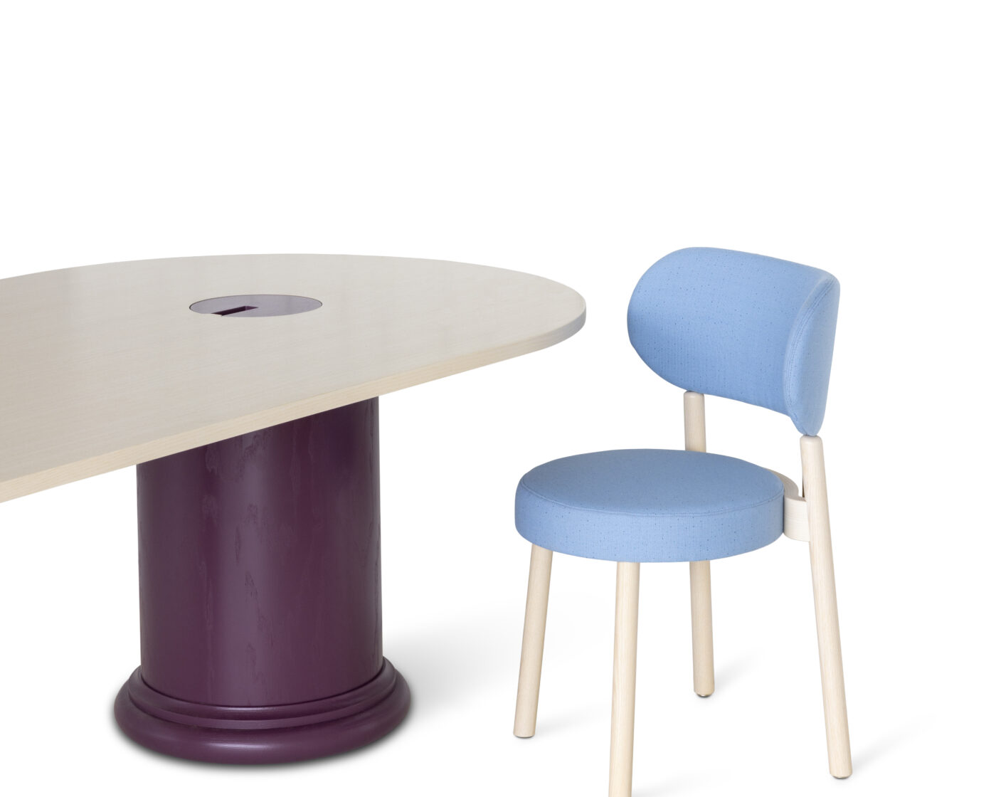 En stol med lekfulla former och genomtänkt komfort. Den klädda ryggen och sitsen ger ett inbjudande intryck. Den formpressade ringen i sitsen möter den böjda sargen i underredet och bildar ett spännande möte. Kombinationen skapar både karaktär och stöd, vilket gör stolen lika skön att sitta på länge som den är vacker att se på och blir ett uttrycksfullt inslag i rummet.